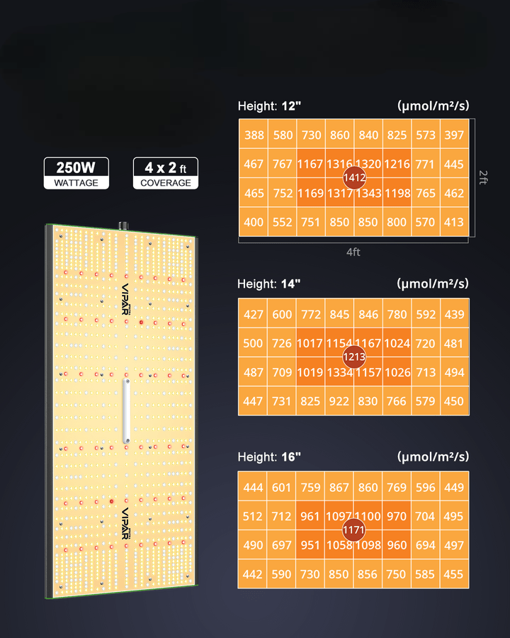 Energy-efficient 250W output with optimized PPFD coverage, providing uniform lighting for medium grow spaces.